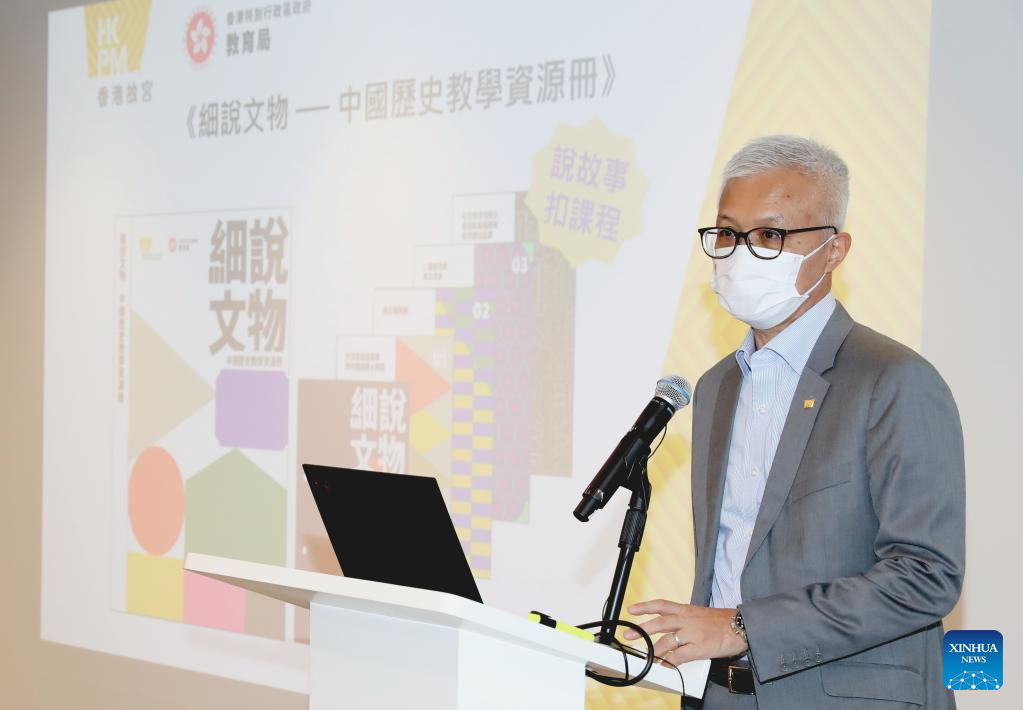 Louis Ng, director of the Hong Kong Palace Museum (HKPM), introduces a book of teaching resources featuring various exhibits of the HKPM in south China's Hong Kong, July 18, 2022. The HKPM has partnered with the Education Bureau (EDB) of the Hong Kong Special Administrative Region (HKSAR) government in publishing a book of teaching resources in an effort to foster a passion for Chinese history and culture among secondary school students, the museum announced Monday.…
