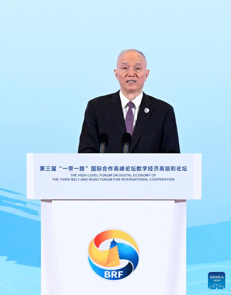 Cai Qi, a member of the Standing Committee of the Political Bureau of the Communist Party of China (CPC) Central Committee and a member of the Secretariat of the CPC Central Committee, attends and delivers a speech at the High-level Forum on Digital Economy of the Third Belt and Road Forum for International Cooperation (BRF) in Beijing, capital of China, Oct. 18, 2023.…