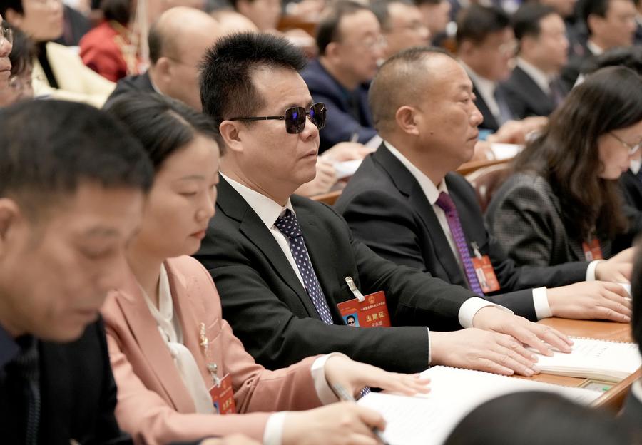 BEIJING, March 11 (Xinhua) -- Seated in the Great Hall of the People in Beijing, Chinese national lawmaker Wang Yongcheng ran his fingers along raised dots of the Braille government work report as he listened to the document delivered by the premier.