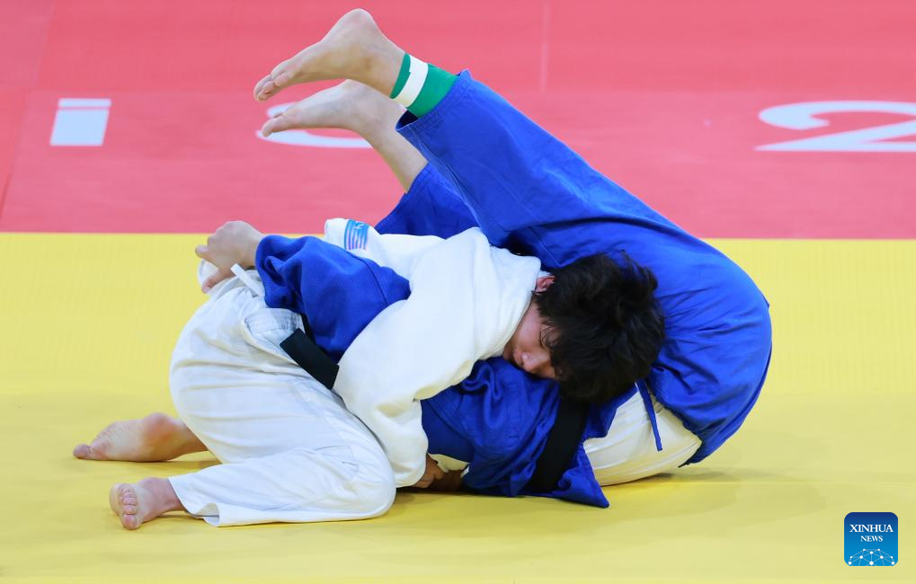 Liu Li (Top) of China competes against Brenda Souza de Freitas of Brazil during the women's -70 kg J1 final of para judo at the Paris 2024 Paralympic Games in Paris, France, Sept. 6, 2024.…
