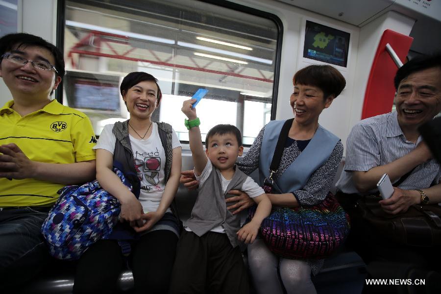People take subway Line 1 in Wuxi City, east China's Jiangsu Province, May 25, 2014. The subway Line 1 of Wuxi started trial operation on Sunday. With the line's official opening to traffic in late June, Wuxi will become the third city in Jiangsu to have subway. (Xinhua/Huan Yueliang)