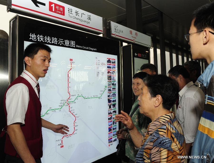 People consult a staff member on subway Line 1 in Wuxi City, east China's Jiangsu Province, May 25, 2014. The subway Line 1 of Wuxi started trial operation on Sunday. With the line's official opening to traffic in late June, Wuxi will become the third city in Jiangsu to have subway. (Xinhua/Huan Yueliang)