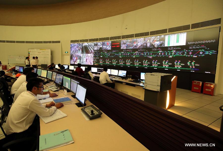 Workers monitor passenger flow of every station at the subway control center in Wuxi City, east China's Jiangsu Province, May 25, 2014. The subway Line 1 of Wuxi started trial operation on Sunday. With the line's official opening to traffic in late June, Wuxi will become the third city in Jiangsu to have subway. (Xinhua/Huan Yueliang)