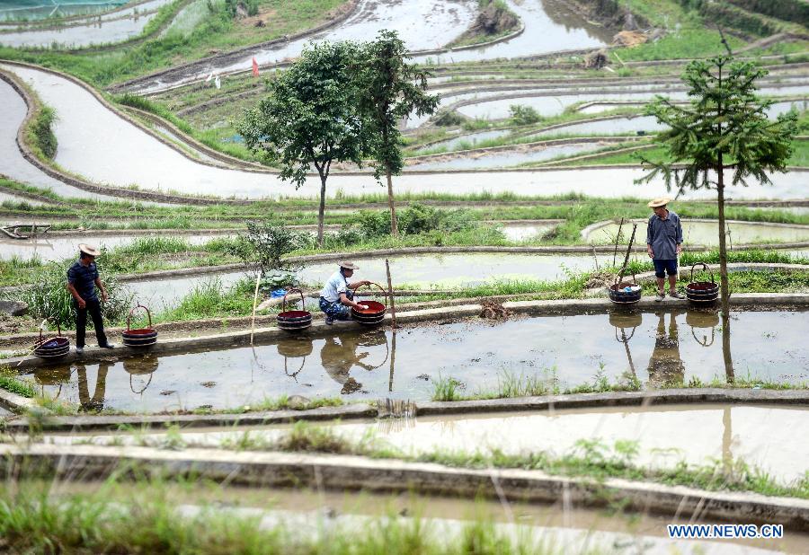 Farmers put fish in the terraced fields in Xiaozhoushan Township of Qingtian County, east China's Zhejiang Province, May 29, 2014. Local farmers have the long tradition of raising fish in the rice fields. (Xinhua/Xu Yu)