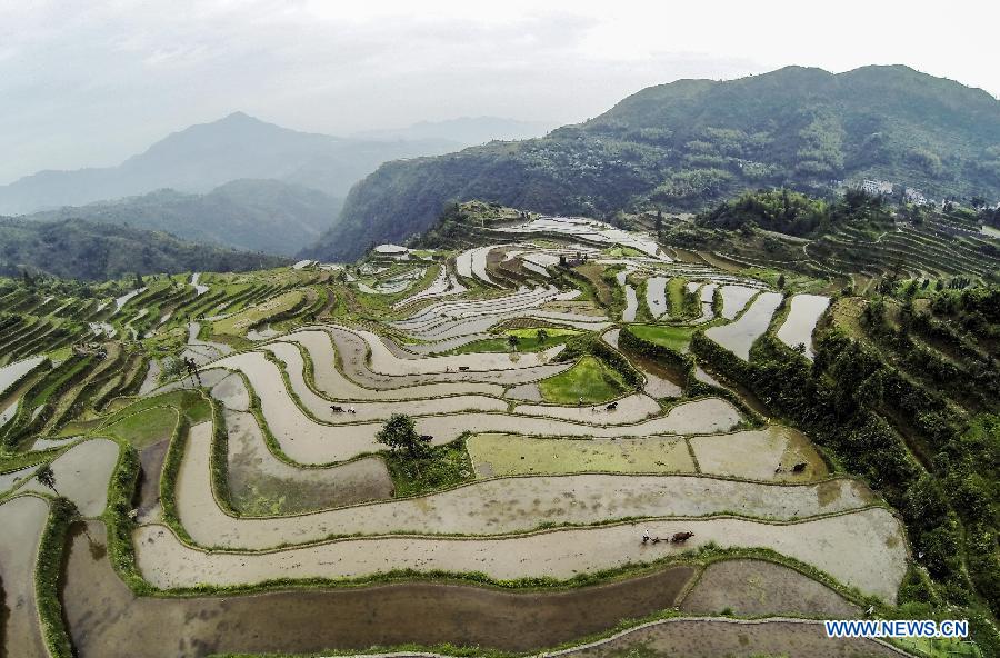 Farmers prepare to put fish in the terraced fields in Xiaozhoushan Township of Qingtian County, east China's Zhejiang Province, May 29, 2014. Local farmers have the long tradition of raising fish in the rice fields. (Xinhua/Xu Yu)