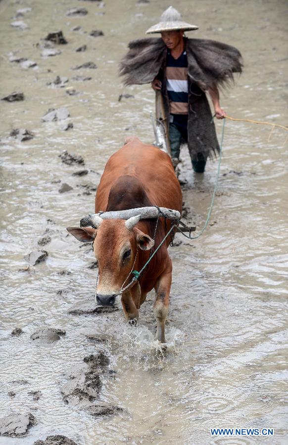 A farmer ploughs the terraced field in Xiaozhoushan Township of Qingtian County, east China's Zhejiang Province, May 29, 2014. (Xinhua/Xu Yu)
