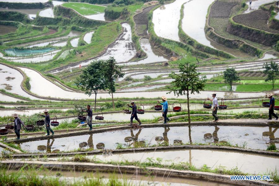 Farmers prepare to put fish in the terraced fields in Xiaozhoushan Township of Qingtian County, east China's Zhejiang Province, May 29, 2014. Local farmers have the long tradition of raising fish in the rice fields. (Xinhua/Xu Yu)