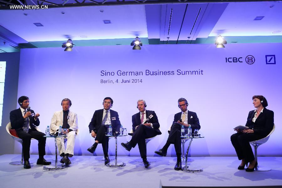 Chairman of the Industrial and Commercial Bank of China (ICBC) Jiang Jianqing (3rd L) and Co-chairman of the board of directors of Deutsche Bank Juergen Fitschen (3rd R) attend a discussion forum of the 2014 Sino German Business Summit in Berlin, Germany, on June 4, 2014. (Xinhua/Zhang Fan)