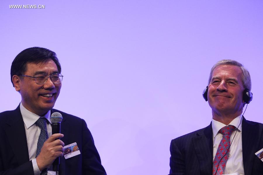 | Chairman of the Industrial and Commercial Bank of China (ICBC) Jiang Jianqing (L) and Co-chairman of the board of directors of Deutsche Bank Juergen Fitschen attend a discussion forum of the 2014 Sino German Business Summit in Berlin, Germany, on June 4, 2014. (Xinhua/Zhang Fan) |