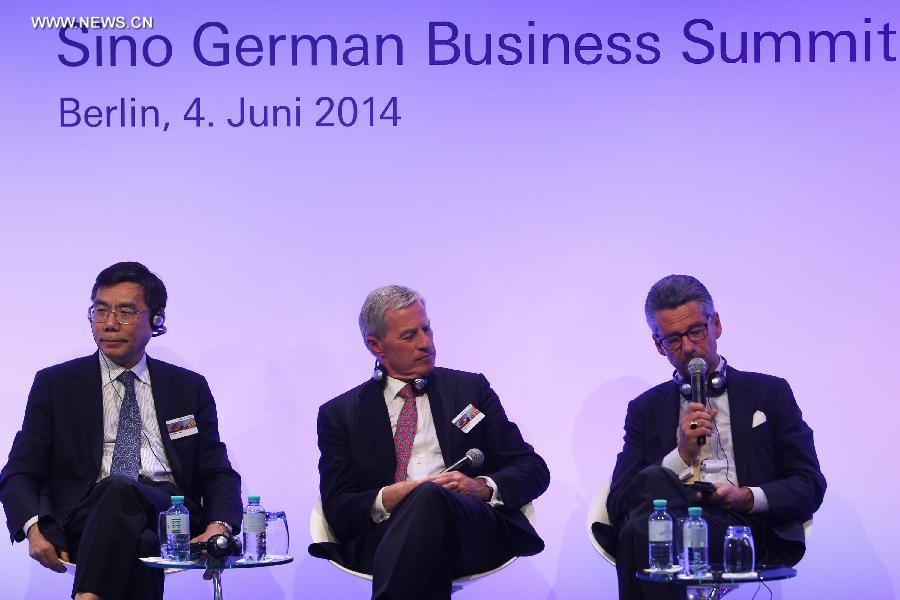 Chairman of the Industrial and Commercial Bank of China (ICBC) Jiang Jianqing (L) and Co-chairman of the board of directors of Deutsche Bank Juergen Fitschen (C) attend a discussion forum of the 2014 Sino German Business Summit in Berlin, Germany, on June 4, 2014. (Xinhua/Zhang Fan)