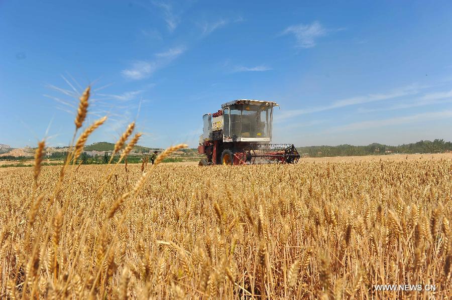 A combine harvester works in a wheat field in Mashidong Village under Shaozhuang Town in Qingzhou, east China's Shandong Province, June 4, 2014. Summer wheat harvest has begun in Shandong, a major producing area of the crop. (Xinhua/Wang Jilin)