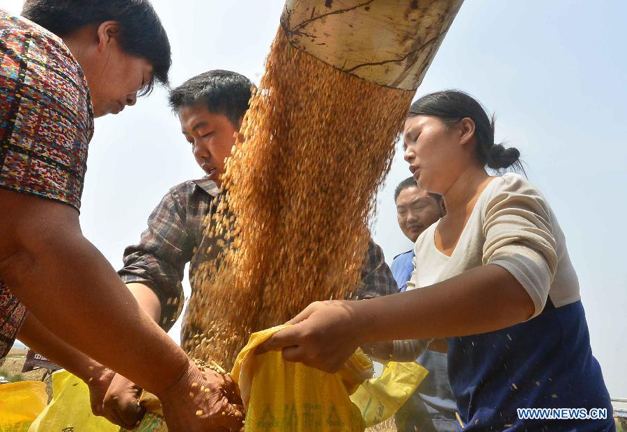 Farmers collect harvested wheat in Huzhuang Village under Yuanyang County, central China's Henan Province, June 3, 2014. Harvest work is in progress amid wheat fields in Henan, a major producing area of the crop. (Xinhua/Wang Song)