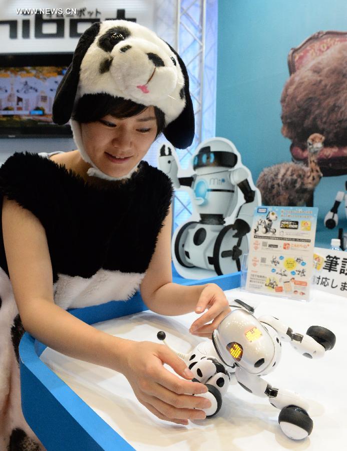 A staff member displays a dog robot during the International Tokyo Toy Show in Tokyo, capital of Japan, June 12, 2014. The International Tokyo Toy Show opened here on Thursday. Some 157 attendees from Japan and other countries and regions displayed about 35,000 new toys during the show. (Xinhua/Ma Ping)