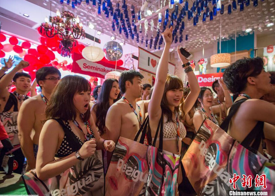 The picture published on Tuesday June 24, 2014, shows that shoppers wearing colorful swimwear in Tokyo, Japan, pose for a picture at a local store, which has promised that the first 100 consumers who shopped there bedecked in swimwear would be given certain products, free of charge, as part of a promotion. [Photo: Chinanews.com]