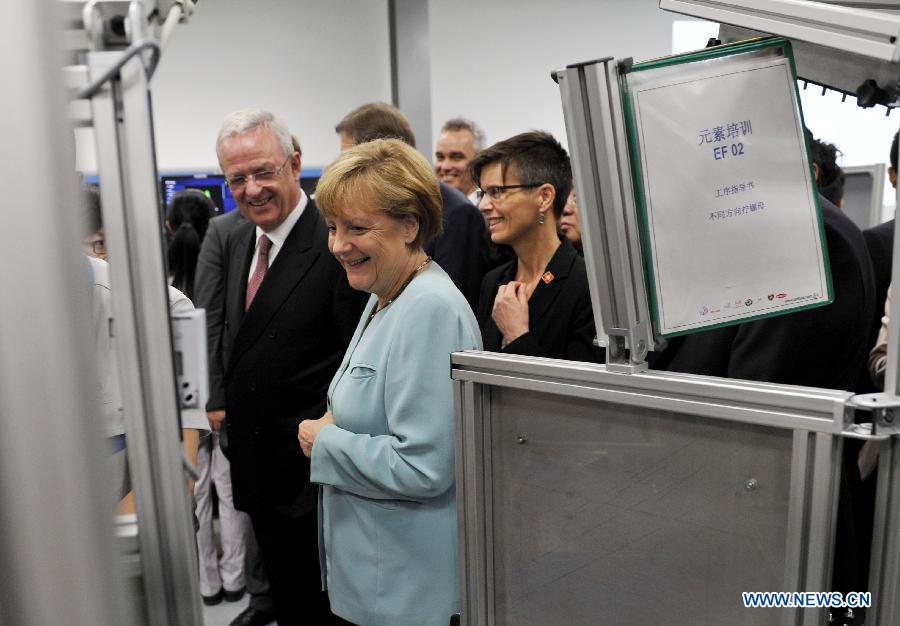 German Chancellor Angela Merkel (front) visits the branch company of FAW-Volkswagen in Chengdu, capital of southwest China's Sichuan Province, July 6, 2014. Merkel is on her seventh China visit as chancellor from July 6 to 8. (Xinhua/Xue Yubin)