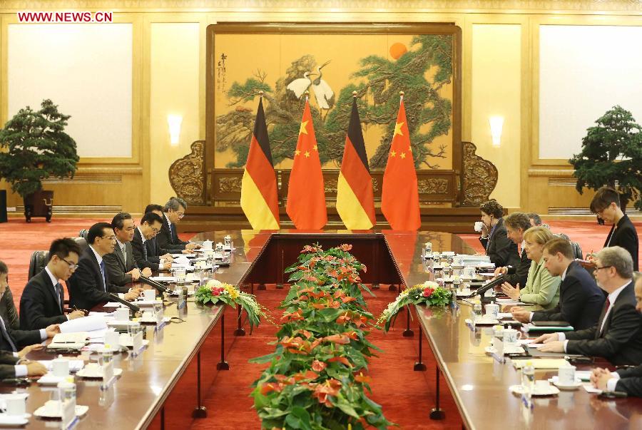 Chinese Premier Li Keqiang (2nd L) holds talks with German Chancellor Angela Merkel (3rd R, front) in Beijing, capital of China, July 7, 2014. (Xinhua/Liu Weibing)