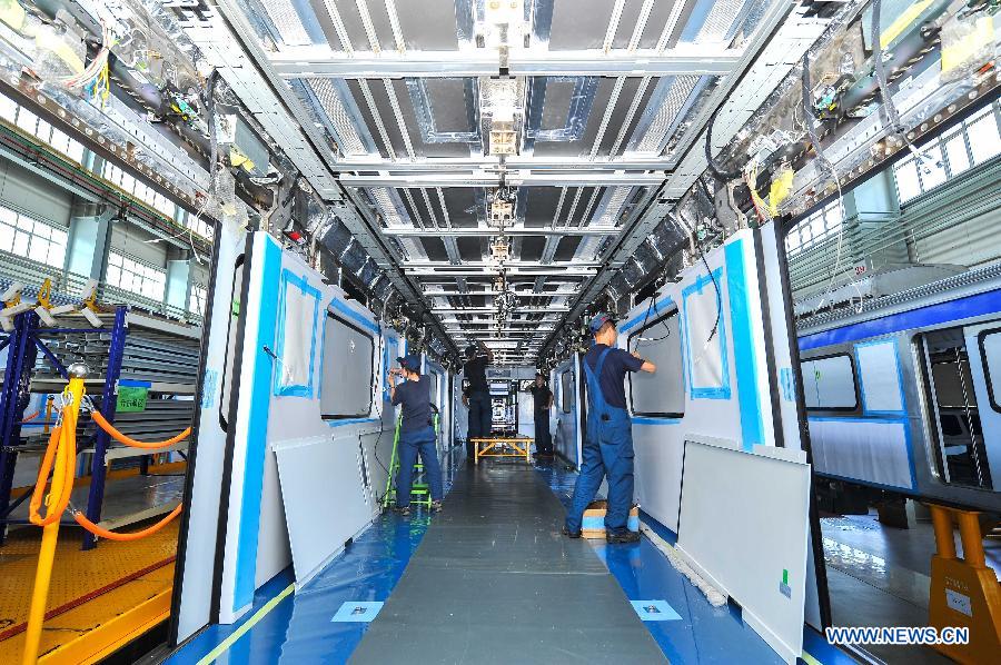 Workers install electronics for an EMU train to be sold to Brazil in a factory of CNR Changchun Railway Vehicles, a train manufacturer, in Changchun, capital of northeast China's Jilin Province, July 9, 2014. The Chinese company is making EMU trains for customers in Brazil and Argentina under purchase orders amounting to 100 and 150 trains respectively. It is also the manufacturer of train units which will serve the 2016 Summer Olympic Games in Rio de Jeneiro. (Xinhua/Xu Chang)