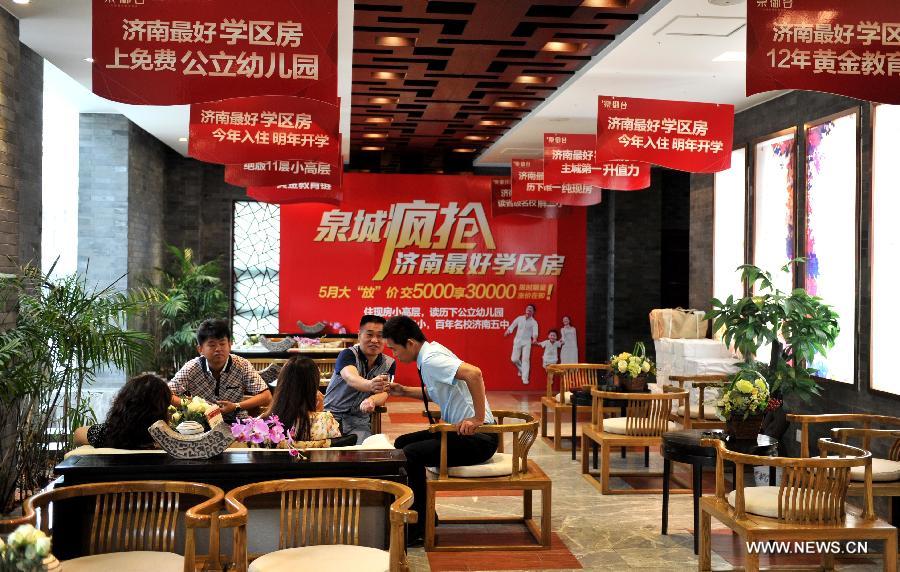 People consult information at a sales office of new residential buildings in Jinan, capital of east China's Shandong Province, July 10, 2014. Jinan on Thursday lifted its three-year home purchase restrictions by allowing residents to buy more properties. (Xinhua/Xu Suhui)