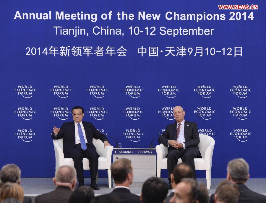 Chinese Premier Li Keqiang (L) and Klaus Schwab, founder and executive chairman of the World Economic Forum (WEF) attend a meeting ahead of the Summer Davos forum in Tianjing Municipality, north China, Sept. 9, 2014. (Xinhua/Wang Ye)