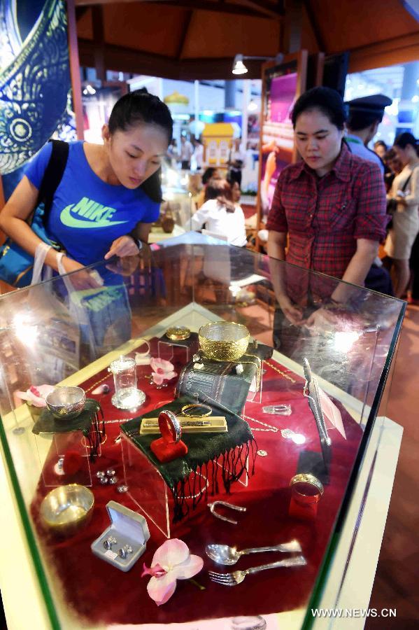 A customer (L) looks at Thai jewellery during the 11th China-ASEAN Expo (CAEXPO) in Nanning, capital of south China's Guangxi Zhuang Autonomous Region, Sept. 17, 2014. The 11th CAEXPO will be held here from Sept. 16 to 19. CAEXPO takes place annually in Nanning and is expected to promote free trade between China and the ASEAN countries. (Xinhua/Zhang Ailin)