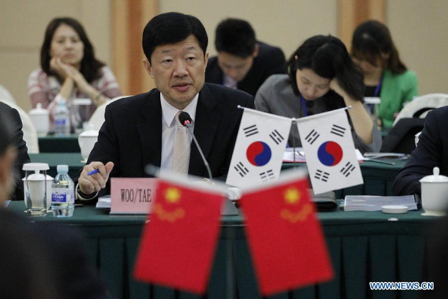South Korean Assistant Commerce Minister Woo Tae-hee speaks during the opening ceremony of the 13th round of the China-South Korea free trade agreement negotiations in Beijing, capital of China, Sept. 22, 2014. (Xinhua/Xing Guangli)
