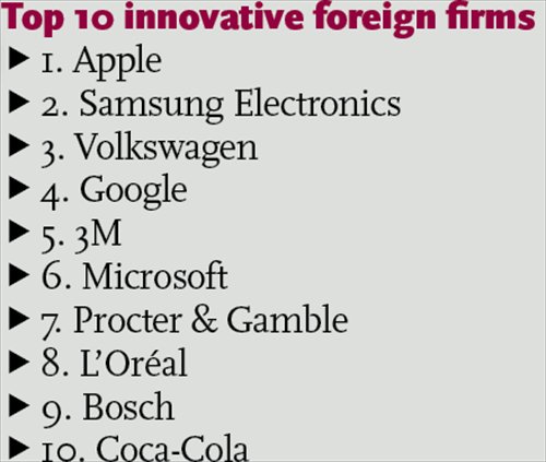 A separate list that names the top 10 innovative foreign companies in the mainland market was also announced on Tuesday, placing Apple Inc, Samsung Electronics and Volkswagen Group China among the top three.