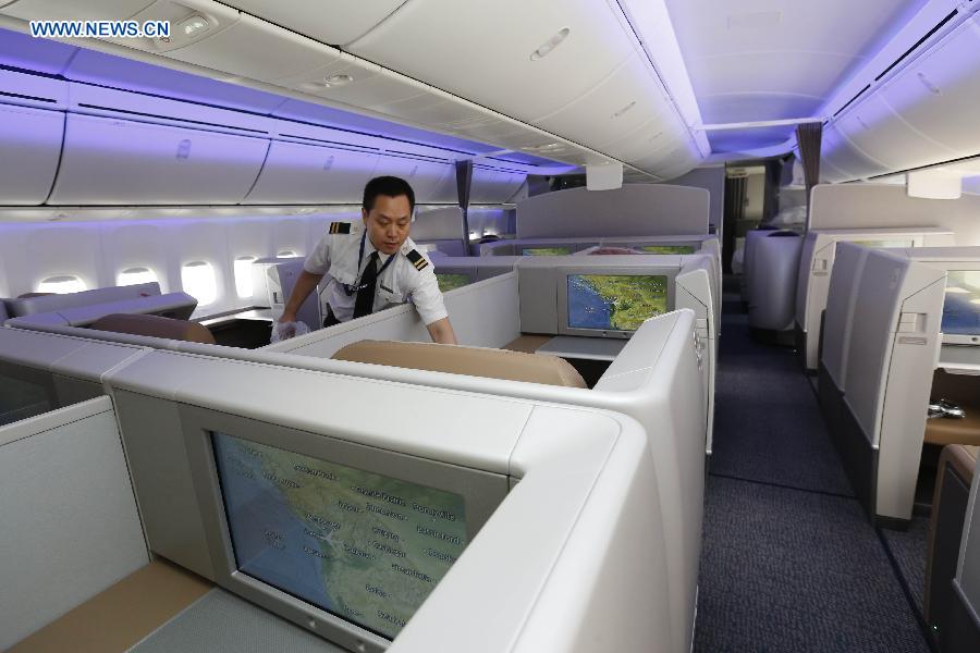 A staff member works before takeoff inside a Boeing 747-8 of Air China, China's biggest airline, in Seattle, the United States, Sept. 30, 2014. Air China on Monday received the latest Boeing 747-8 Intercontinental airplane at a delivery ceremony in Seattle and on Wednesday flew the plane back to Beijing, China. (Xinhua/Zhang Yuwei)