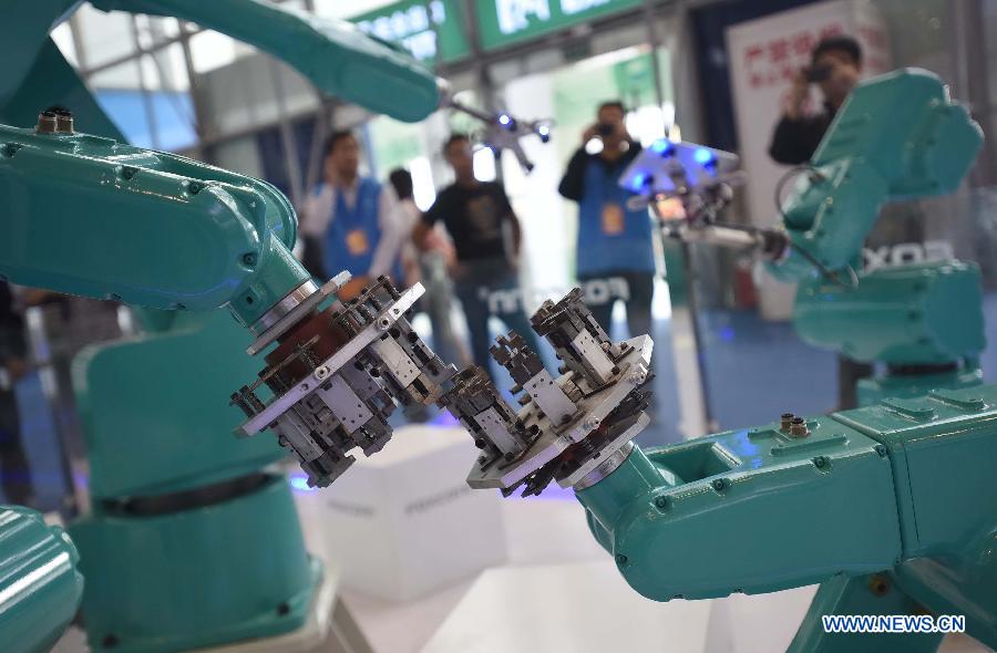 | Visitors view the robotic hand at the 15th Western China International Fair (WCIF) in Chengdu, capital of southwest China's Sichuan Province, Oct. 23, 2014. Over 9,000 exhibitors from 76 countries and regions took part in the WCIF, which opened here Thursday. (Xinhua/Xue Yubin) |