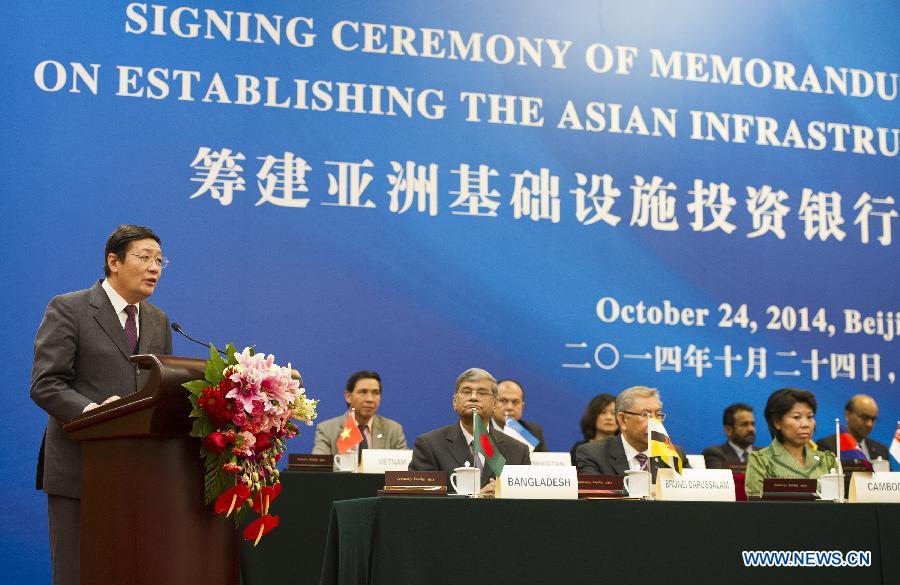 Chinese Finance Minister Lou Jiwei speaks at the signing ceremony of the Memorandum of Understanding on Establishing Asian Infrastructure Investment Bank (AIIB) in Beijing, capital of China, Oct. 24, 2014. Twenty-first Asian countries that are willing to join AIIB as founding members on Friday signed the Memorandum of Understanding on Establishing AIIB. (Xinhua/Huang Jingwen)