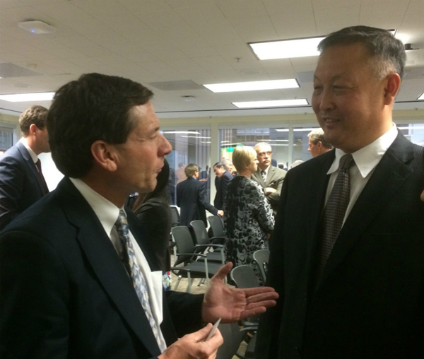 | Zhang Yujing (R), president of China Chamber of Commerce for Import and Export of Machinery and Electronic Products talks with Douglas Boxer(L), CEO of Signature trade group at the conference Thursday in San Francisco. (Han Shasha/People's Daily Online) |