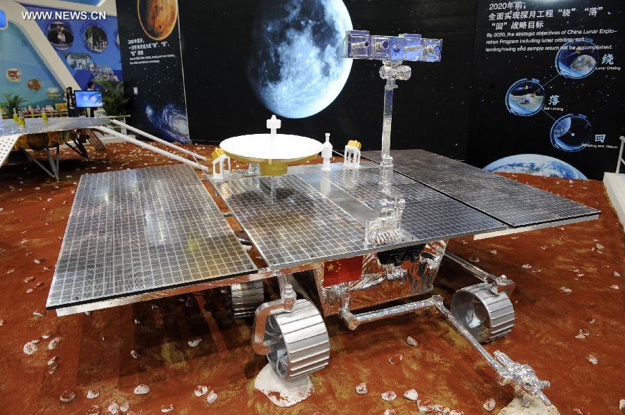 A model of the Mars rover is seen ahead of the 10th China International Aviation and Aerospace Exhibition in Zhuhai, south China's Guangdong Province, Nov. 9, 2014. Some 700 exhibitors at home and abroad with 130-plus planes will attend the six-day airshow from November 11 to 16. (Xinhua/Liang Xu)