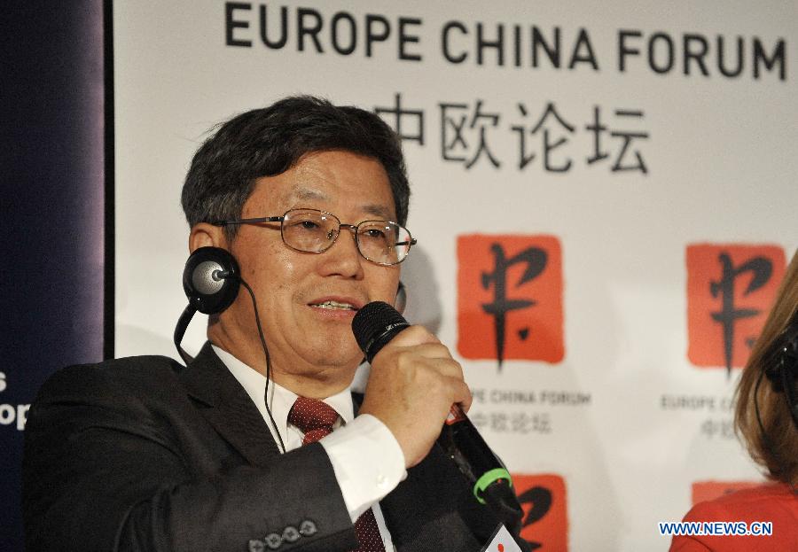 Chi Fulin, president of the China Institute for Reform and Development speaks during the 4th Europe China Forum in Brussels, Belgium, Nov. 18, 2014. (Xinhua/Ye Pingfan)