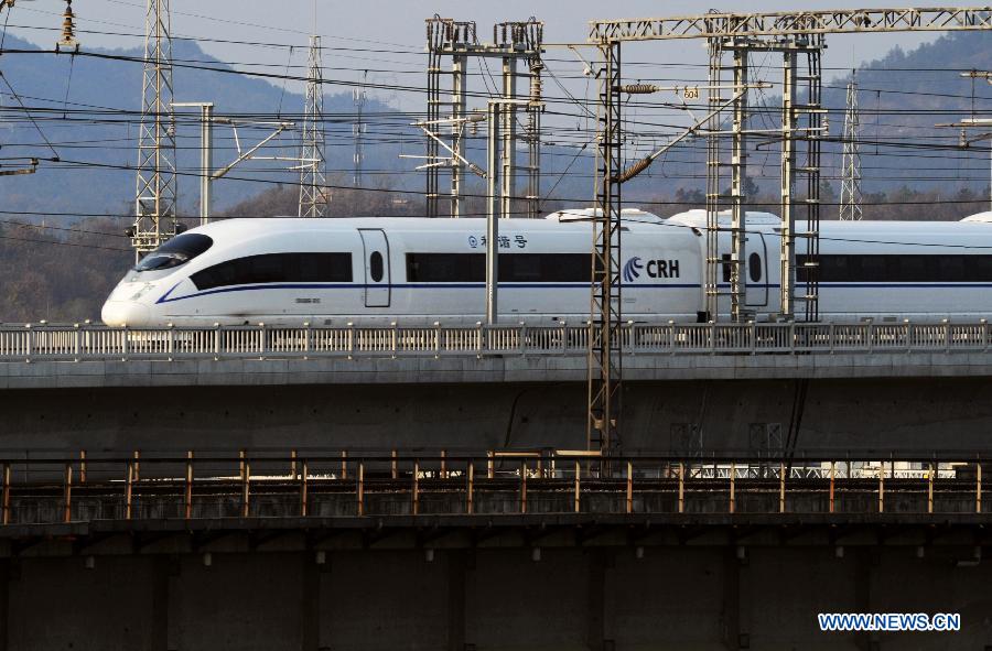 A test high-speed train runs on the Dongte Bridge during a trial operation of the Hangzhou-Nanchang railroad, a part of the section of the Shanghai-Kunming high-speed railway, in Yiwu, east China's Zhejiang Province, Dec. 4, 2014. The Hangzhou-Nanchang high-speed railway, which connects Hangzhou and Nanchang, capitals of east China's Zhejiang and Jiangxi Provinces respectively, will start operation on Dec. 10. The Hangzhou-Nanchang railway, which will link with the newly-operational Nanchang-Changsha high-speed railway, is expected to facilitate easy connection between China's central regions and prosperous east. The Shanghai-Kunming railway will eventually joins Shanghai in the east and Kunming in the southwest. (Xinhua/Tan Jin)