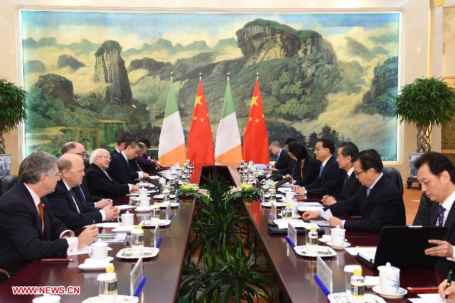 Chinese Premier Li Keqiang (4th R) meets with Irish President Michael D. Higgins (4th L) at the Great Hall of the People in Beijing, capital of China, Dec. 10, 2014. (Xinhua/Rao Aimin)