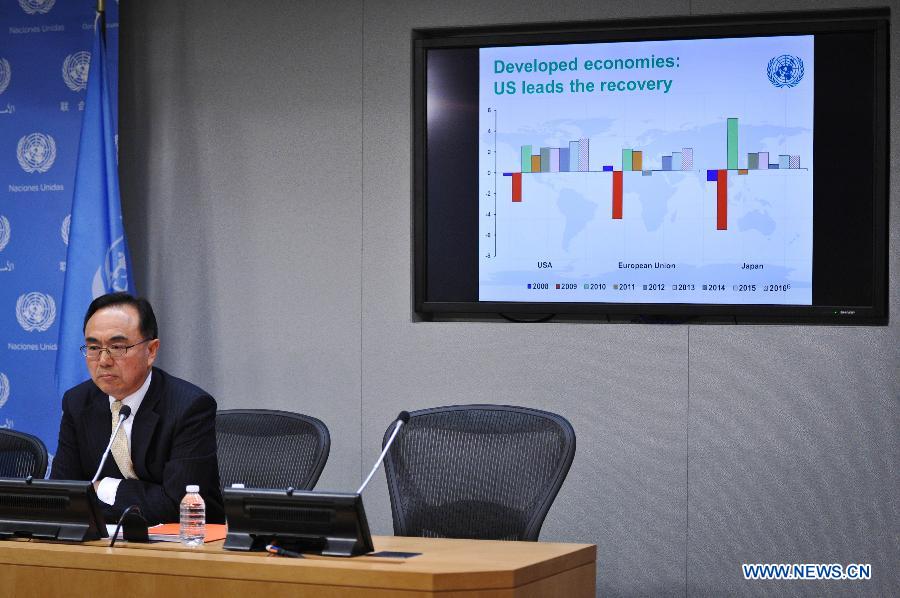 | Pingfan Hong, Director of the Development and Policy Analysis Division for the UN Department of Economic and Social Affairs, speaks during a press conference to preview the World Economic Situation and Prospects 2015 report, at the UN headquarters in New York, on Dec. 10, 2014. Global economic growth is forecast to increase marginally over the next two years, but mounting uncertainties could undermine the growth, said a UN report launched Wednesday. (Xinhua/Niu Xiaolei) |