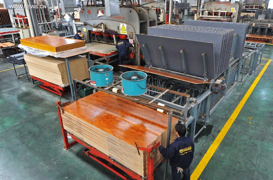 Staff members work at a production line of a wood facory in the Nanxun District of Huzhou City, east China's Zhejiang Province, Dec. 26, 2014. In order to break out the bottleneck of economic development, a series of technical transformation was launched in traditional manufacturing industry in the Nanxun District of Huzhou in 2014. (Xinhua/Tan Jin)