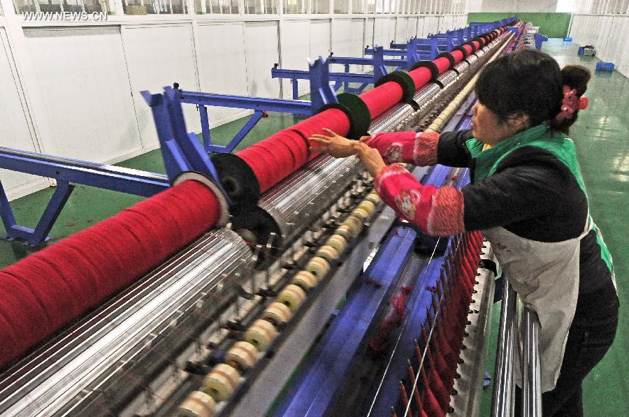 A staff member works at an automatic production line of a textile company in the Nanxun District of Huzhou City, east China's Zhejiang Province, Dec. 25, 2014. In order to break out the bottleneck of economic development, a series of technical transformation was launched in traditional manufacturing industry in the Nanxun District of Huzhou in 2014. (Xinhua/Tan Jin)