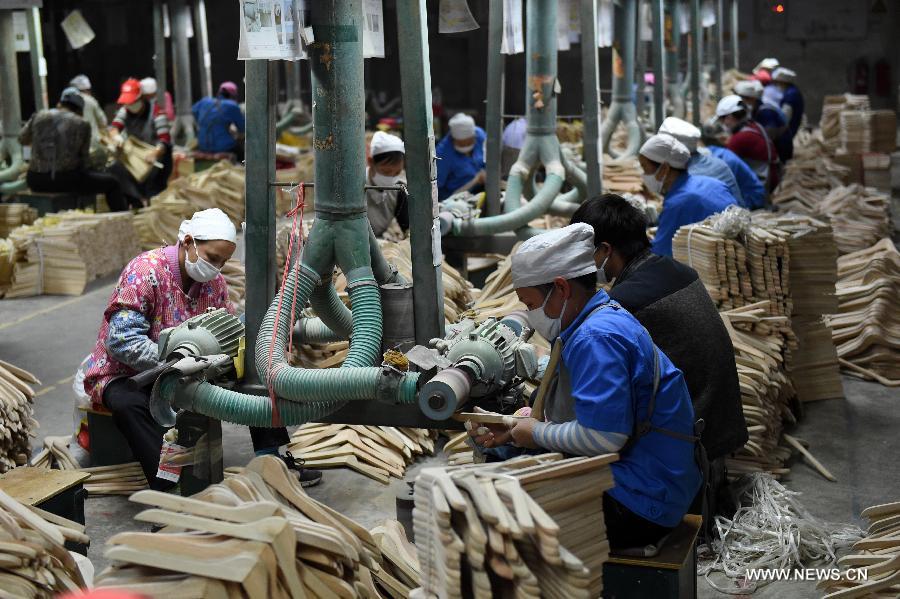 Workers process clothes hangers at a factory in Lipu County, southwest China's Guangxi Zhuang Autonomous Region, Jan. 6, 2015. With 126 factories manufacturing clothes hangers, the yearly output of the trade in Lipu reached 6.5 billion RMB yuan (about 1.06 billion U.S. dollars). (Xinhua/Lu Bo'an)