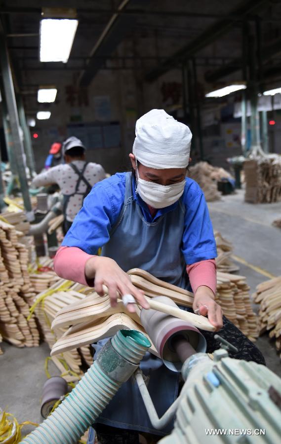 Workers process clothes hangers at a factory in Lipu County, southwest China's Guangxi Zhuang Autonomous Region, Jan. 6, 2015. With 126 factories manufacturing clothes hangers, the yearly output of the trade in Lipu reached 6.5 billion RMB yuan (about 1.06 billion U.S. dollars). (Xinhua/Lu Bo'an)