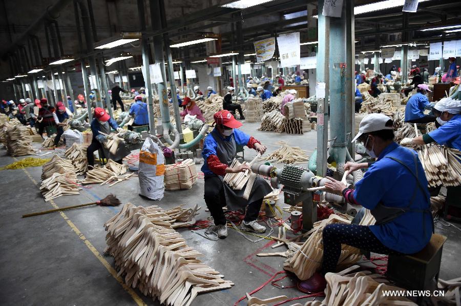 | Workers process clothes hangers at a factory in Lipu County, southwest China's Guangxi Zhuang Autonomous Region, Jan. 6, 2015. With 126 factories manufacturing clothes hangers, the yearly output of the trade in Lipu reached 6.5 billion RMB yuan (about 1.06 billion U.S. dollars). (Xinhua/Lu Bo'an) |