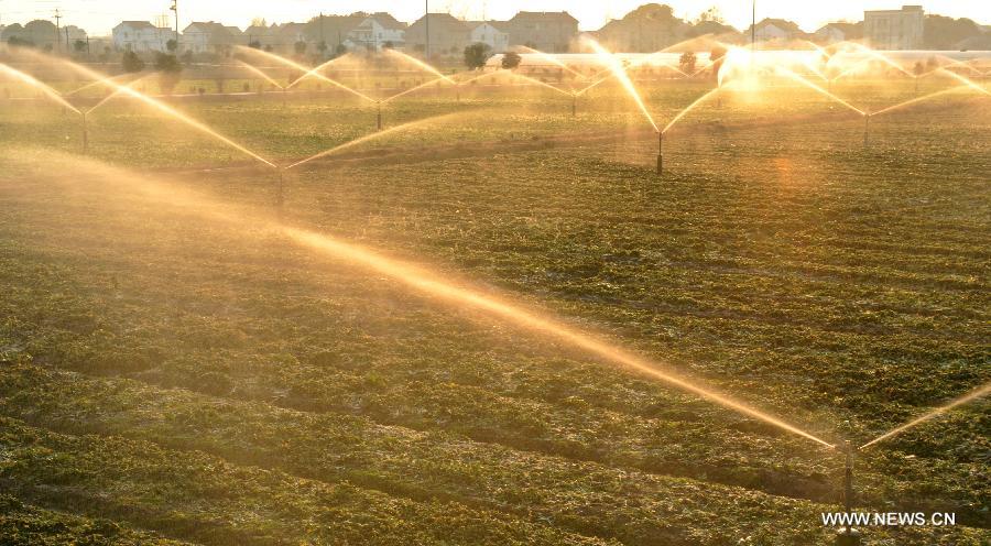 Photo taken on Dec. 29, 2014 shows vegetable watered in a modern agricultural garden in Huzhou City, east China's Zhejiang Province. According to official statistics, the disposable per capita income of farmers in Zhejiang reached 19,373 Yuan in 2014, 1.5 times of the average of the whole country. Zhejiang has ranked the first in disposable per capita income of farmers among provinces and autonomous regions across China for 30 consecutive years. (Xinhua/Tan Jin)