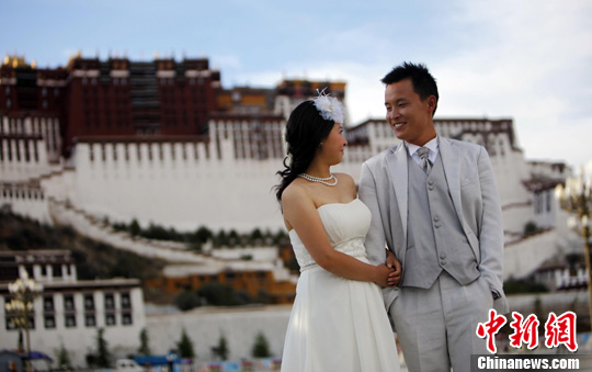 | A couple takes wedding photo in front of Potala Palace. (CNS/Du Yang) |