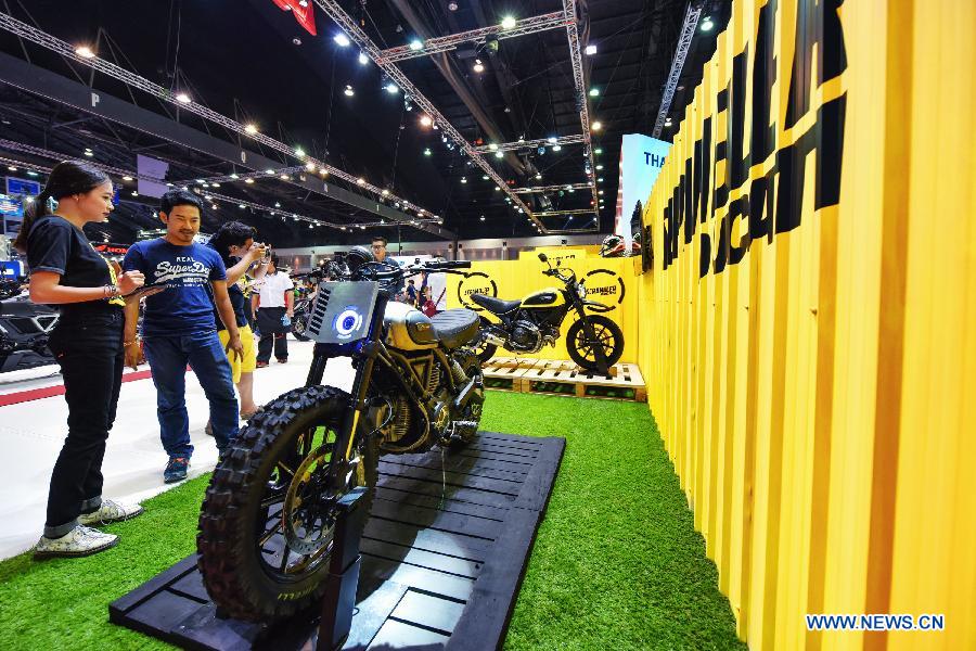 Visitors look at a motorcyle exhibited in the 36th Bangkok International Motor Show in Bangkok, March 25, 2015. The Bangkok International Motor Show will be held from March 25 to April 5. (Xinhua/Li Mangmang)