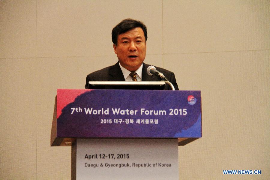 China's Vice Minister of Water Resources Jiao Yong speaks during a trilateral ministerial meeting at the seventh World Water Forum held in Gyeongju, South Korea, April 13, 2015. China, South Korea and Japan on Monday agreed to strengthen trilateral cooperation on water policy innovation during the seventh World Water Forum held in South Korea's southeastern cities of Daegu and Gyeongju. (Xinhua/Peng Qian)