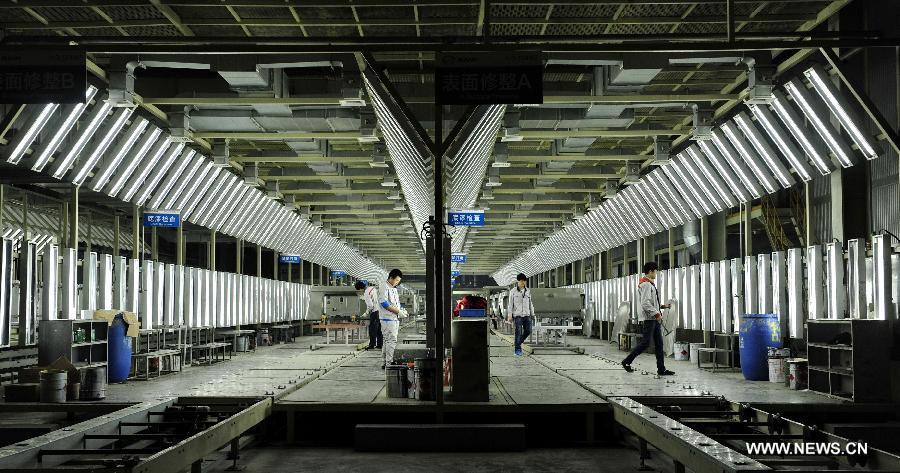 People work at a factory of China's Beijing Automotive Industry Corp (BAIC) in Huanghua, north China's Hebei Province, March 19, 2015. China's GDP expanded 7 percent year-on-year in the first quarter, the National Bureau of Statistics(NBS) data showed on April 15, 2015. (Xinhua/Mou Yu)