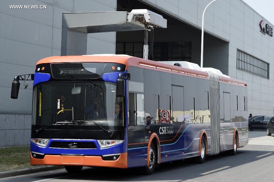 Photo taken on April 16, 2015 shows a 18-meter-long BRT with super capacitor at the Ningbo base of China South Railway (CRS) in Ningbo, east China's Zhejiang Province. Trolley buses with super capacitor featured high power start-up, quick charge and high recycling efficiency. They will be fully charged at a bus station within 30 seconds and running over 5 kilometers. The service life for such a trolley bus will last as long as 12 years. (Xinhua/Ju Huanzong)