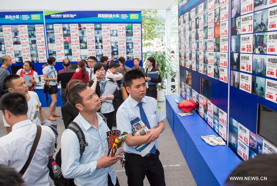People look at second-hand housing information at a housing trade fair in southwest China's Chongqing Municipality, April 16, 2015. The four-day spring housing trade fair of Chongqing kicked off here Thursday, with 161 housing projects on display. (Xinhua/Liu Chan)