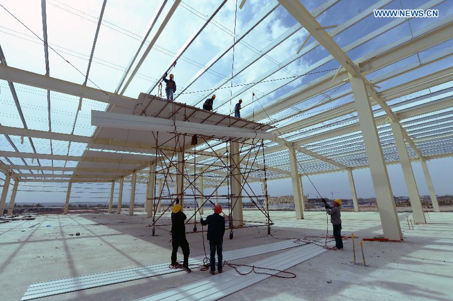 Laborers work at the construction site of the Lanzhou comprehensive bonded zone in Lanzhou, capital of northwest China's Gansu Province, May 8, 2015. The project is expected to be completed by the end of June. (Xinhua/Fan Peishen)