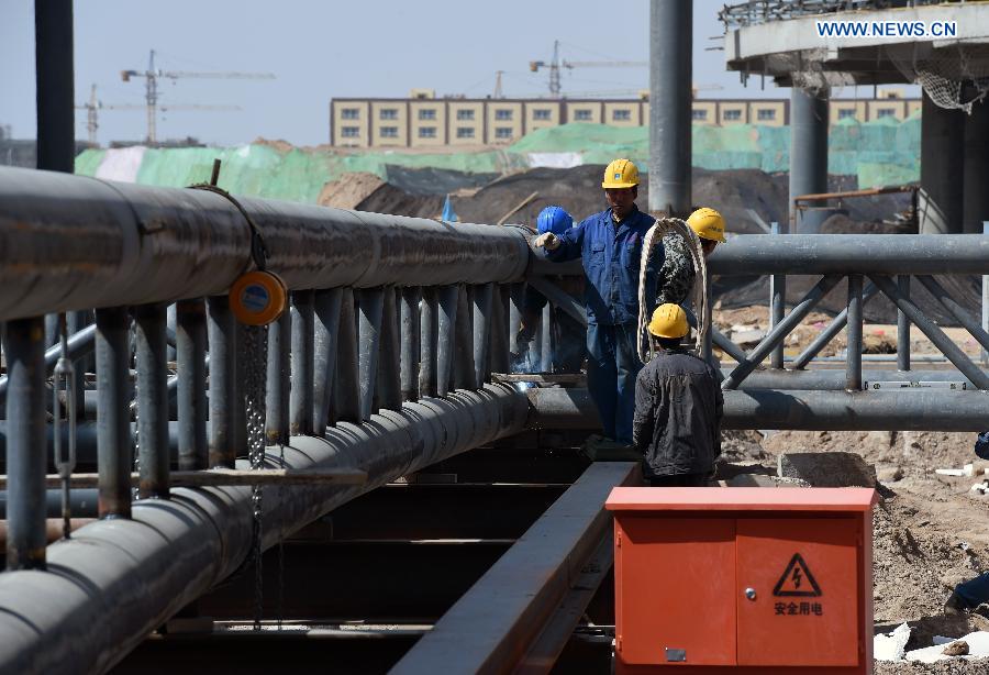 Laborers work at the construction site of the Lanzhou comprehensive bonded zone in Lanzhou, capital of northwest China's Gansu Province, May 8, 2015. The project is expected to be completed by the end of June. (Xinhua/Fan Peishen)