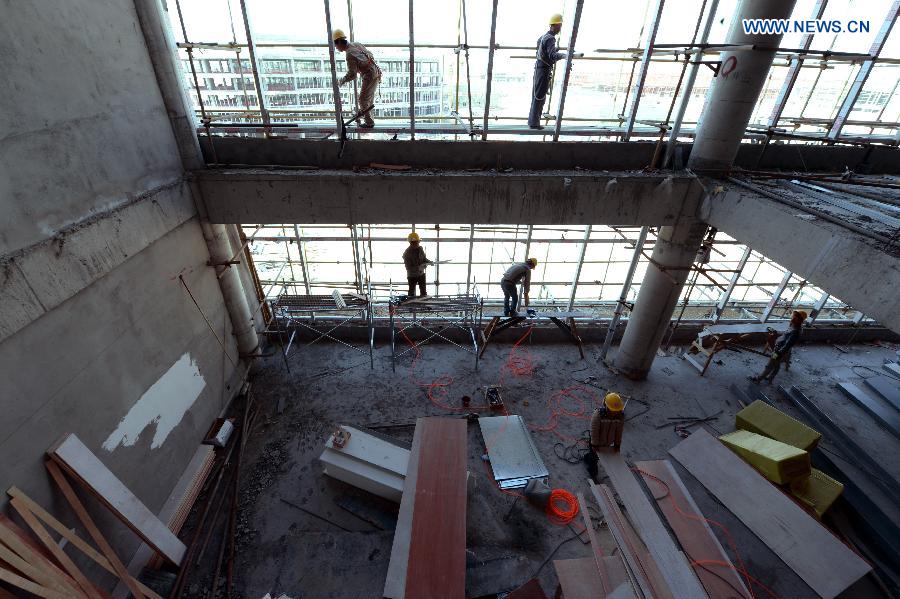 Laborers work at the construction site of the Lanzhou comprehensive bonded zone in Lanzhou, capital of northwest China's Gansu Province, May 8, 2015. The project is expected to be completed by the end of June. (Xinhua/Fan Peishen)